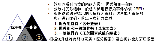 行为事件访谈法”(Behavioral Event Interview,简称BEI)。应用这种方法,先找出表现优异的人员和一般称职的人员,分为优秀者和一般者两组,通过访谈其行为事件,分别与他们进行特殊沟通,采用对比分析的方法,总结出优秀者和一般者在行为和思维方式上的差异。